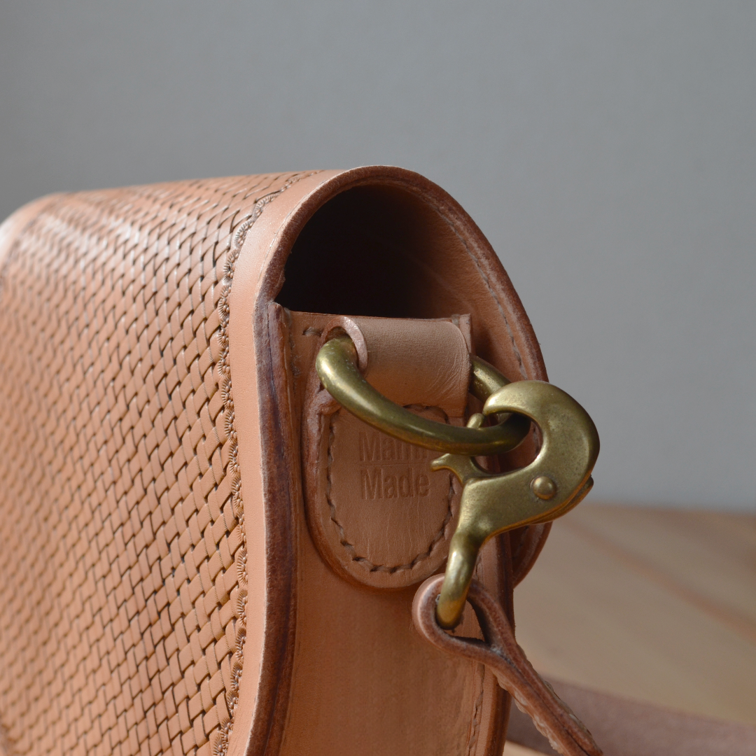姫路産のナチュラルヌメ革を使用し、表面には手打ちによる美しいバスケット模様をあしらいました。持つ人のスタイルを選ばない、ナチュラルで上品な佇まいです。