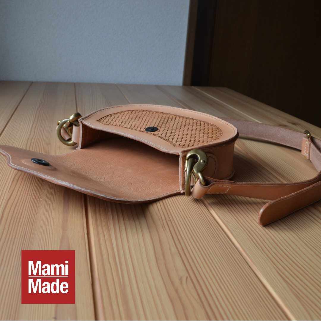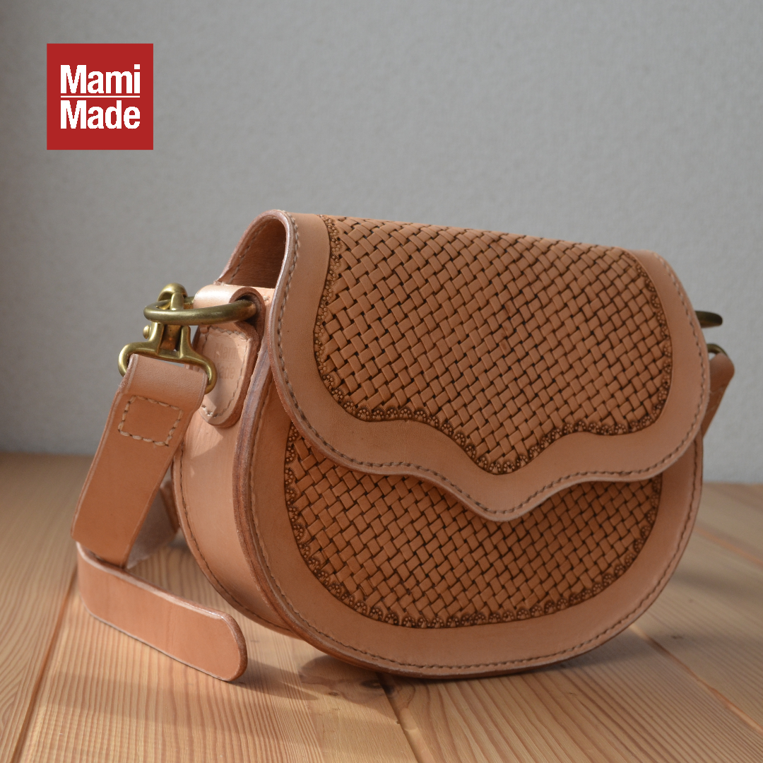 手彫りバスケットスタンプの本革ショルダーバッグ|ナチュラルヌメ革|レザーカービング