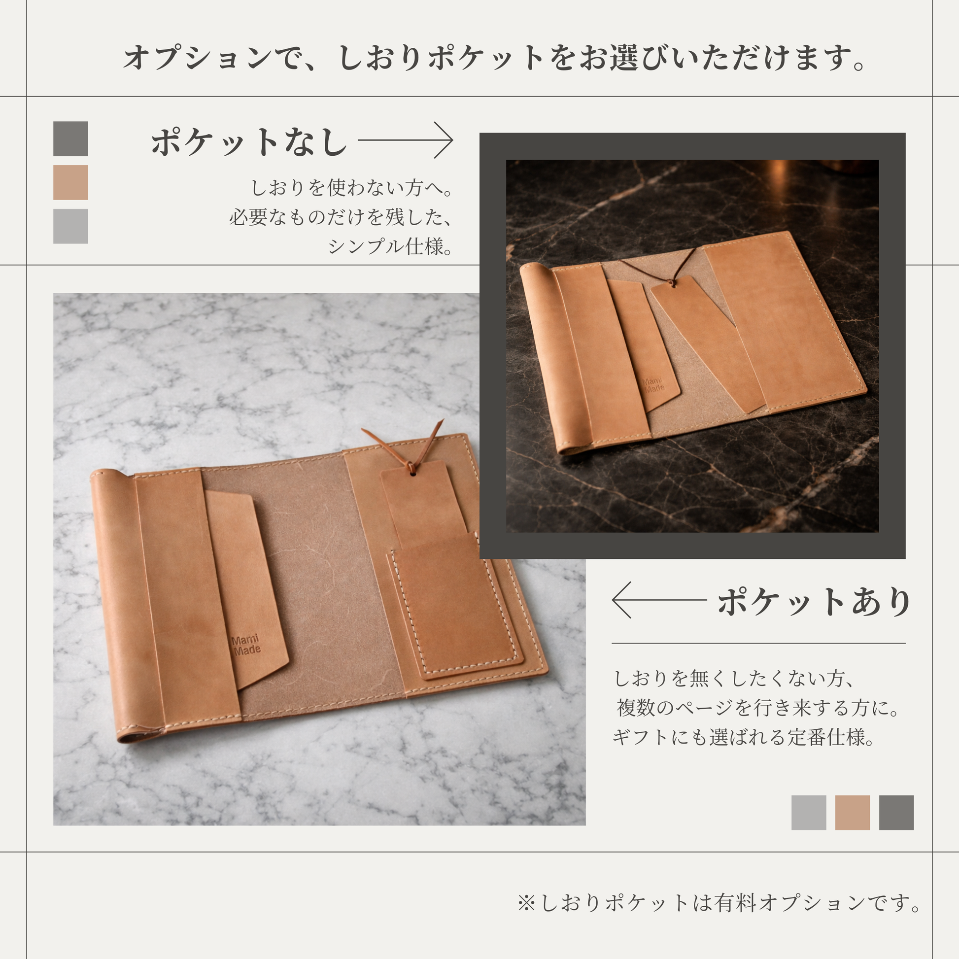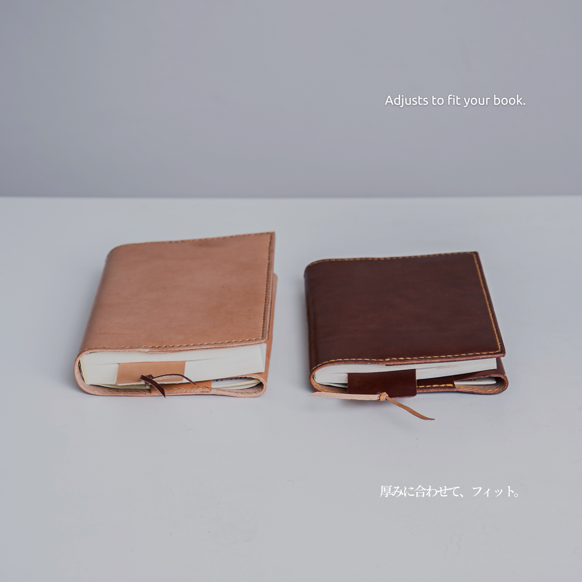 MamiMadeのブックカバーは、姫路産のヌメ革を贅沢に使い、手作業で一つずつ仕立てています。